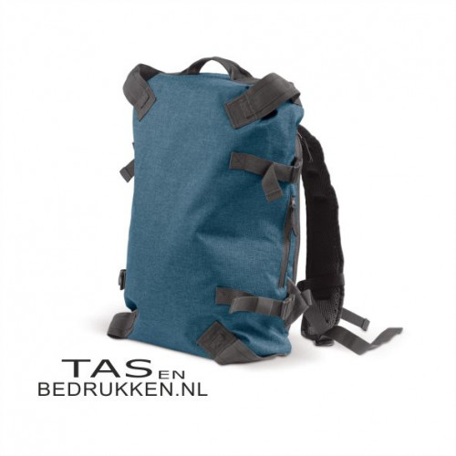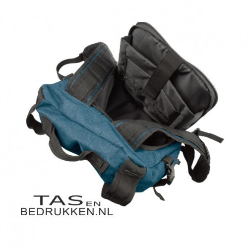 Binnenin is voldoende ruimte voor een laptop (tot 15”), een tablet of andere bezittingen. Aan weerszijden bieden ritsvakjes extra opbergruimte. Kwaliteit polyester in de kleuren blauw en grijs.
